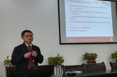 师生作系列讲座。讲座的主题包括:中国“走出去”过程中的翻译问题;如何在口笔译中实现真正的国际沟通?从中英两国早期交往史看口笔译活动的作用;从语言学习到内容学习——语言和翻译专业学生的竞争优势;口译能力有何特别之处?——从语言能力到口译能力的进阶;翻译学研究项目的选题——基于英国艺术和人文基金项目(AHRC)的分析。讲座分别由a漫