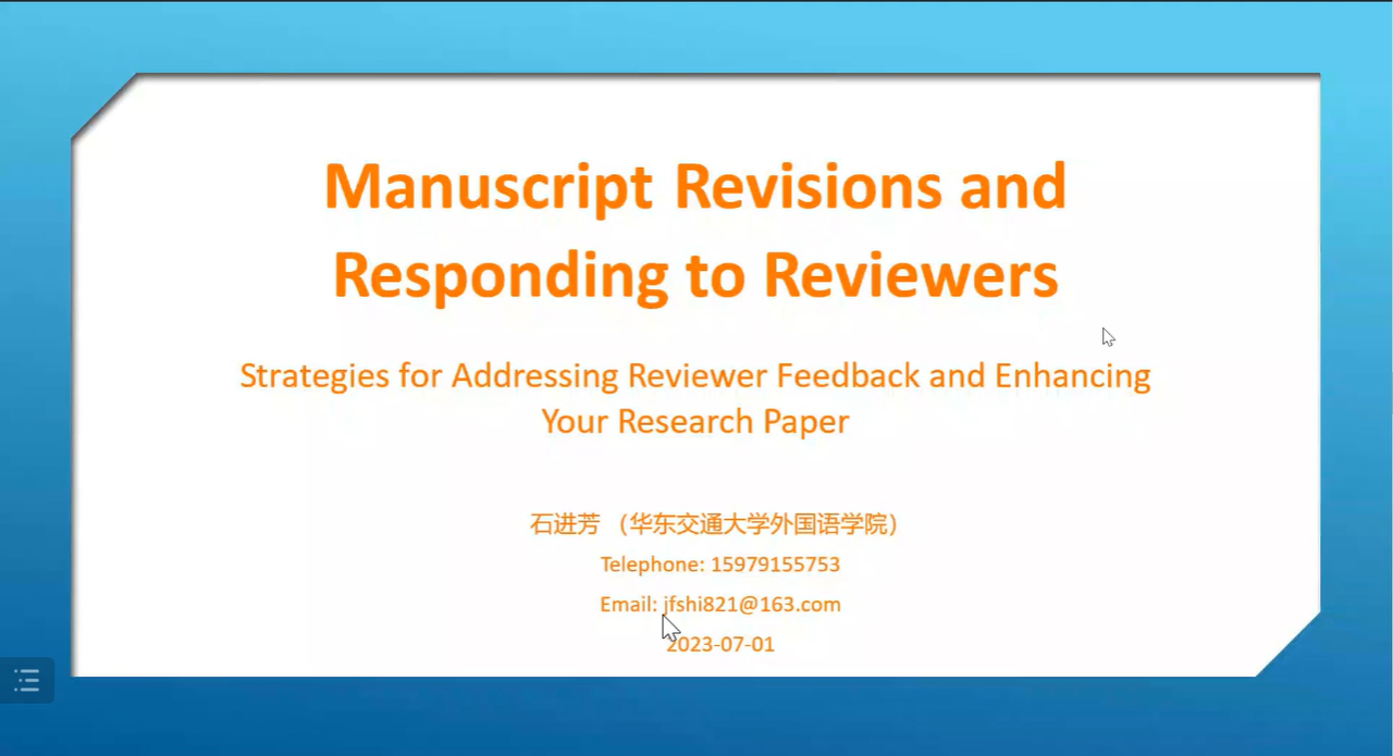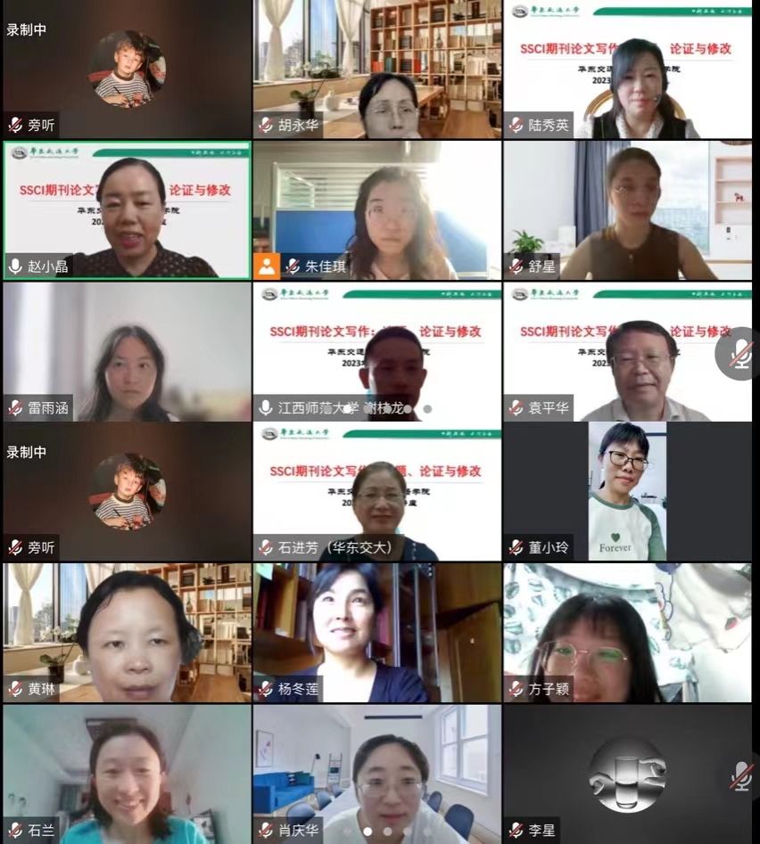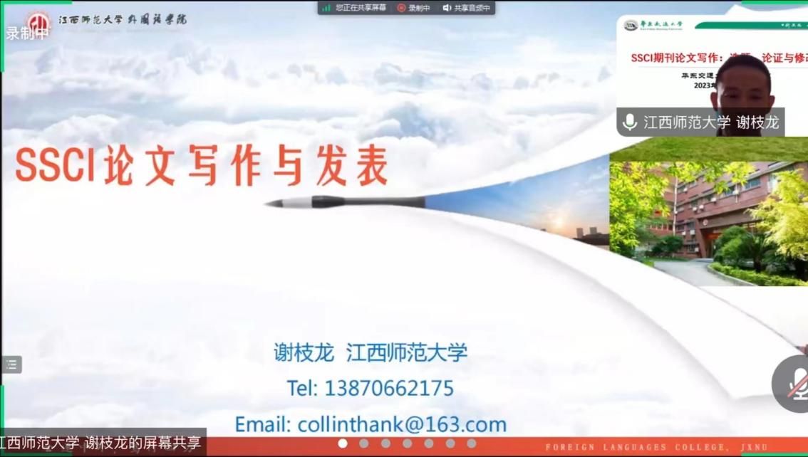 为加强学院学科建设,增强师生对国际期刊论文写作的了解,2023年 7月3日学院举办了主题为“SSCI期刊论文写作:选题、论证与修改”的系列学术讲座。讲座以线上形式进行,由江西师范大学谢枝龙教授、湖南师范大学肖越海教授和a漫