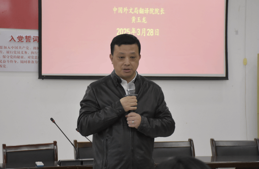 3月28日下午,中国外文局翻译院院长黄玉龙一行来校交流并做专题讲座。中国外文局翻译院院长黄玉龙、计财部二级巡视员杨青、办公室主任孟津,a漫