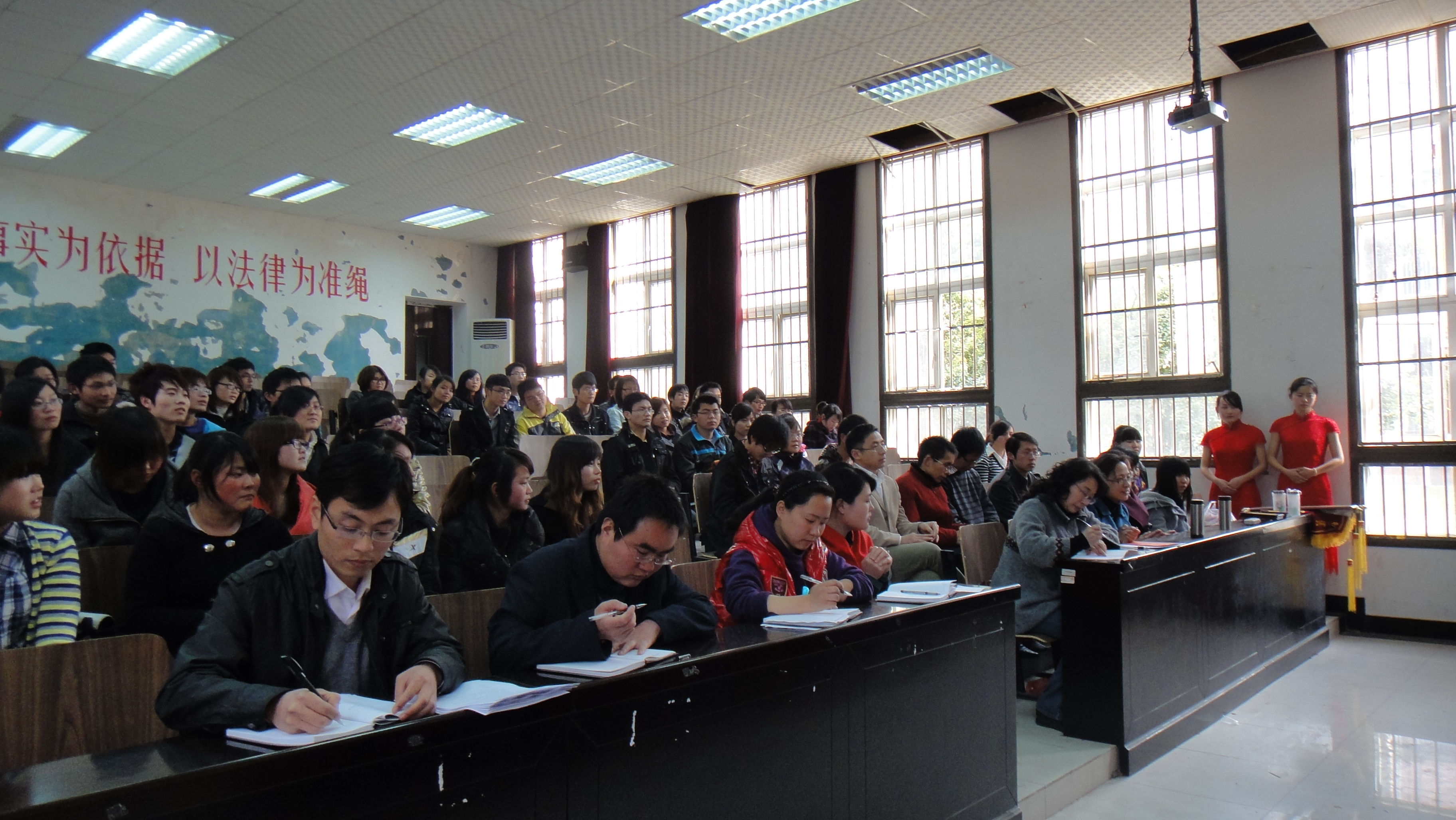 在模拟法庭开展了学习纪检监察工作会议精神的报告会,参会人员有a漫