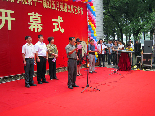 开幕式上,曾友田首先对到场的各位领导、老师以及各位嘉宾进行了介绍并表示热烈欢迎。随后,纪蓉琴发表讲话,她首先对校领导对外院发展的大力支持表示感谢,随后她介绍了“红五月”的发展历史及本届红五月的主题:回味经典,品味名著,并对举办红五月英语文化艺术节的意义进行了阐释,她指出,这项活动不仅开拓了学子们的眼界,对学生以后的长远发展同样起着积极的作用。凌四宝也高度评价了“红五月”英语文化艺术节,他说,“红五月”是学校文化活动中的精品,是一场盛大的视听盛宴,学生们能够通过文化交流汲取营养。他希望本次红五月能够举办的更加有水平,更加精彩。最后凌四宝宣布英语文化艺术节正式开幕。