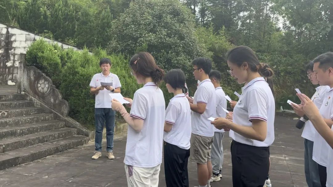 抵达新篁办事处后,实践队队员们徒步前往新篁革命烈士纪念塔,瞻仰革命烈士纪念塔,在烈士纪念塔前集体默哀三分钟,以表追思。最后,电气学院党员代表刘铭涛带领实践队队员在烈士塔前齐声诵读方志敏烈士《可爱的中国》节选,缅怀革命先烈,传承红色精神。