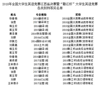 在5月21日结束的2018年全国大学生英语竞赛江西赛决赛暨“赣江杯”大学生英语竞赛中,我校选手发挥出色,多点开花,共计获得各组别和各奖项的特等奖18个,数量达历年之最。其中,在AB组(研究生、英语专业本专科组)组别中,我校a漫