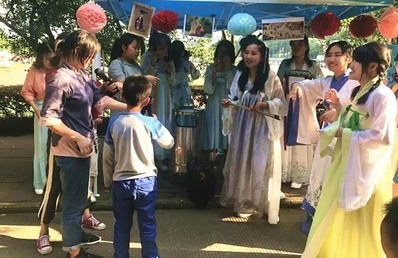 开幕式表演的“服装秀”和演唱歌曲《我和我的祖国》结束后,各班带来了他们特有的主题展示。广袖襦裙,衣袂翻飞,这是古色古香的汉服之美。英语(国际贸易)2018-3带来的精彩“汉服show”既体现了我国传统文化生生不息的活力,更呼应了“大美中国”的主题。弗朗明哥,斗牛披风,这是热情洋溢的西班牙之美。英语(英西复语)2018-1为大家准备了香醇的西班牙风味果酒和现烤的土豆饼,还有将西语和英语结合的“猜单词”游戏,别具一格地向大家展示了多彩的西班牙文化。除此之外,还有源远流长的戏曲之美、神秘原始南非之美……学思路上的“风景”,美不胜收。一份份美食、一个个游戏互动、一件件展品呈现各国风土人情,传递多样文化交织之美。