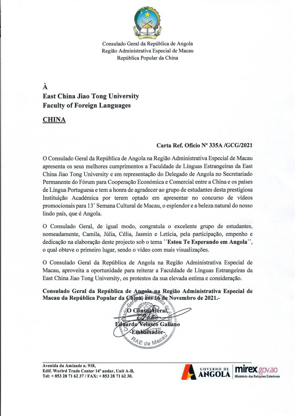 赛后,安哥拉驻澳门特别行政区总领事向我校发函,感谢我校学生向世界展示安哥拉的壮美,同时向获奖团队致以诚挚祝贺,向a漫