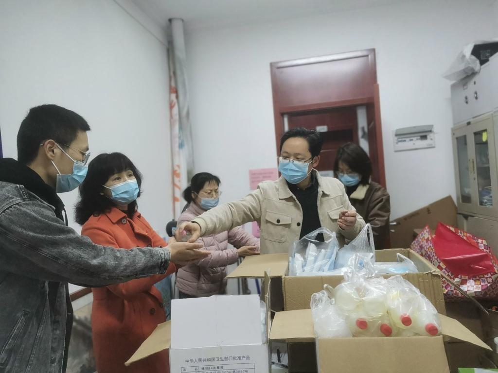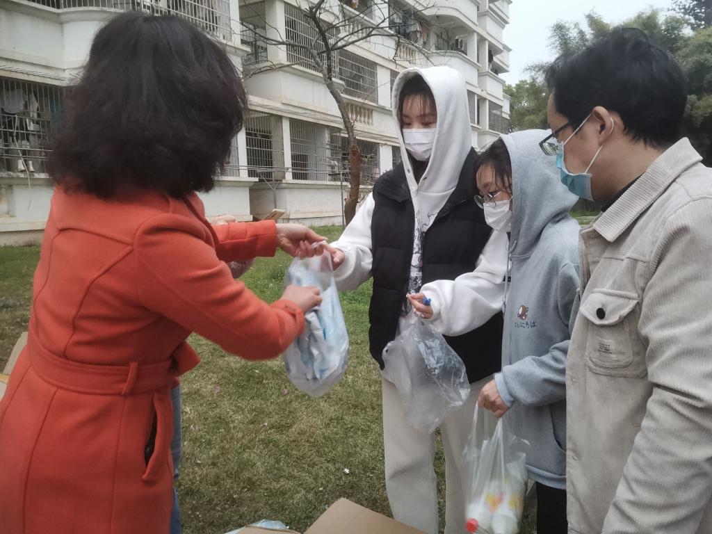 副院长单伟红受院党委和院行政的委托,率领在校教师党员谭涛、刘春莲、龚沁怡和学生党员谢潇等争当“火车头”做表率,一同深入学生宿舍发放防疫物资。他们将防疫物资仔细清点、消毒,第一时间送到了学生宿舍楼下。每一位老师和志愿者也将自身认真仔细消毒,以此减少病毒传播风险,保障每一位同学的绝对安全。