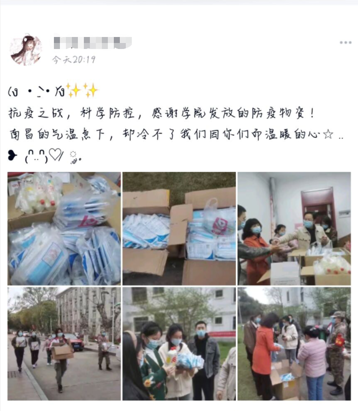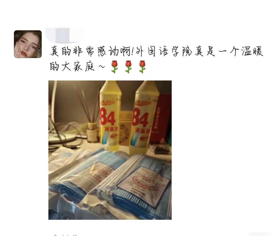 收到防疫物资,同学们都非常高兴,每位同学都认真收好物资,不少同学表示疫情来得太过突然,没能准备充足的口罩和消毒物品,这次学院的防疫物资发放宛如及时雨。同学们纷纷在网络空间表达了对学院的感恩感激之情,并称外院是一个温暖的大家庭。