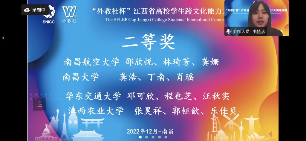 12月3日,由江西省外语学会和上海外语教育出版社联合举办的首届“外教社杯”江西省高校学生跨文化能力大赛邀请赛线上比赛落下帷幕,来自省内各高校的9个团队参赛。在外语学院杨明和吴秋芳老师的指导下,2021级外语学院翻译专业邓可欣,2021级天佑学院程也芝和2022级机电学院汪秋实三位同学组队参赛。我校代表队凭借超凡的实力,获得江西省二等奖的好成绩。