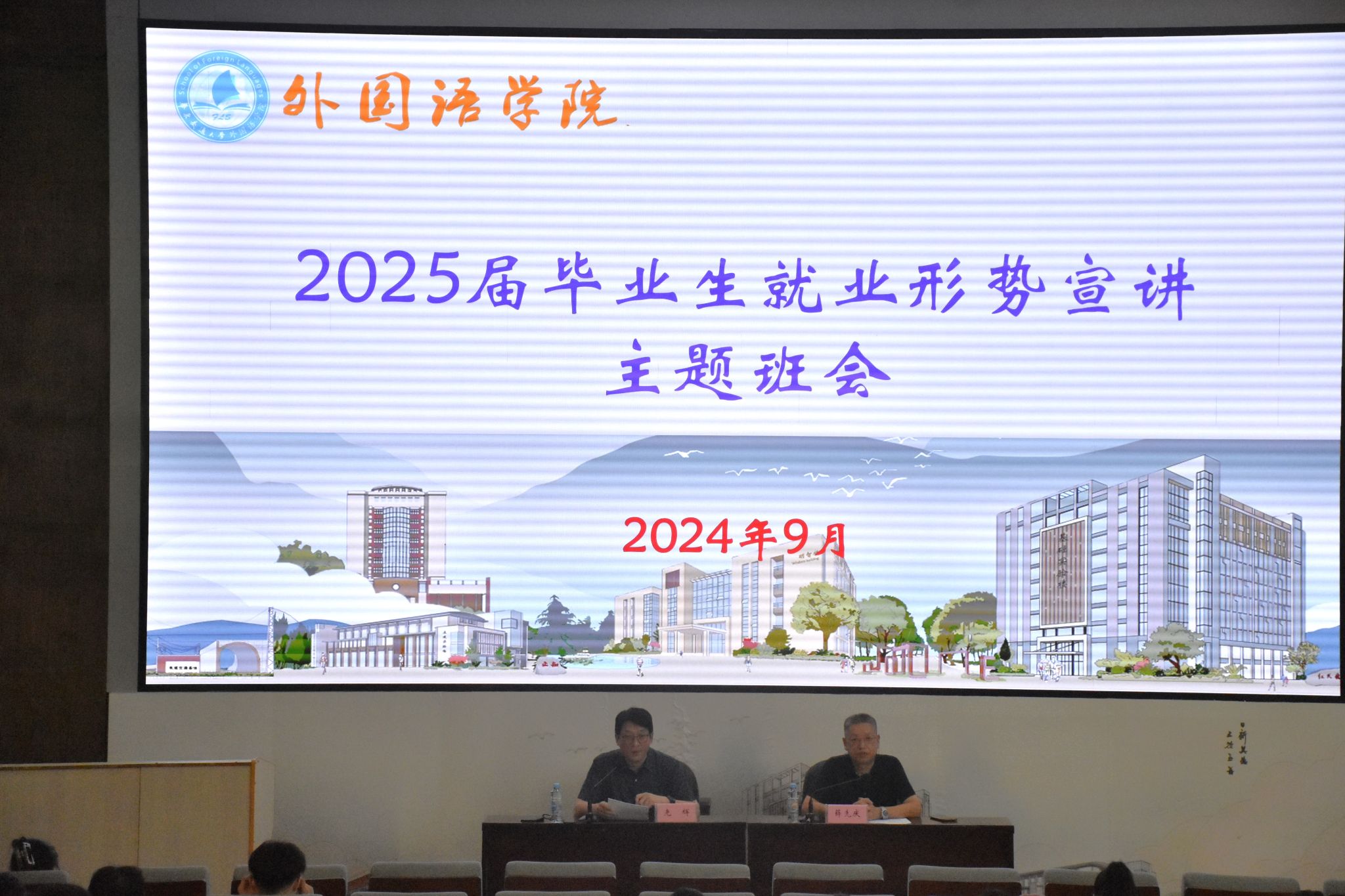 于南区图书馆202召开“2025届毕业生就业形势宣讲”主题班会。本次班会由院党委书记薛先庆主讲,党委副书记光辉、学工办负责人郑伟、2025届毕业生辅导员钟雪倩、王伟峰出席,2025届毕业生及2026届全体同学参加此次会议,本次会议由党委副书记光辉主持。