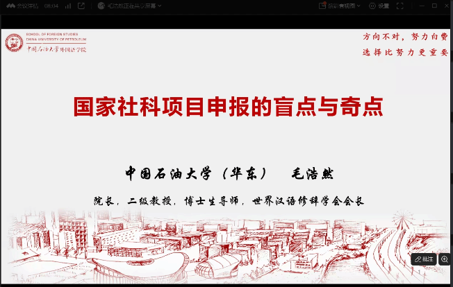 院长毛浩然教授,为学院教师带来一场题为“国家社科项目申报的盲点与奇点”的线上讲座。 毛浩然教授从“国家社科立项的项目分析、申报盲点、申报奇点、选题论证与正反案例、申报结项常见问题解答”五个维度,深入剖析了国家社科项目申报的核心要义。他强调选题的重要性,用“选题是否靠谱,其实占了七八成。方向不对,努力白费”的金句,点明了选题对项目申报成败的关键作用。毛教授还对a漫